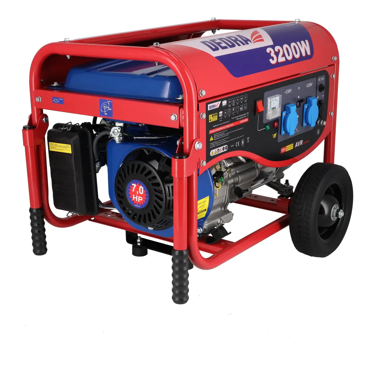Agregat prądotwórczy Dedra można zastosować również jako dodatkowe źródło zasilania wykorzystywane w gospodarstwach domowych, na działkach, kampingach czy obszarach na których odbywają się prace remontowo-budowlane. Rozruch silnika czterosuwowego odbywa się za pomocą linki. Zastosowanie miedzianego uzwojenia silnika zwiększa żywotność całego urządzenia oraz wpływa na stabilną pracę. Zespół prądotwórczy wyposażony jest w 2 gniazda 230V(AC) oraz 1 gniazdo 12V(DC). Generator prądotwórczy posiada 15L zbiornik na paliwo.