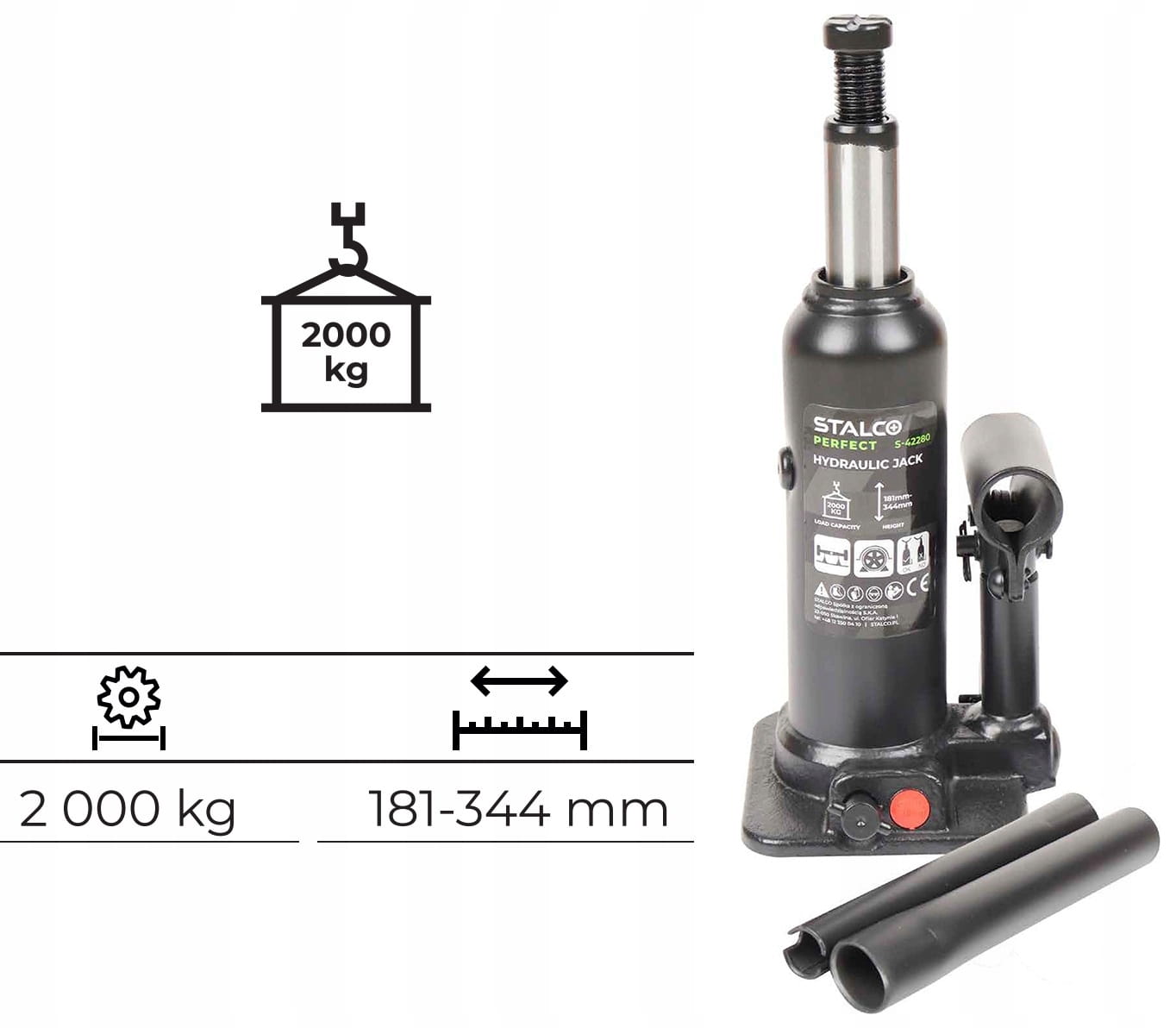 - Zakres podnoszenia: ok. 158–308 mm (typowy zakres dla podnośników 2T tej klasy)
