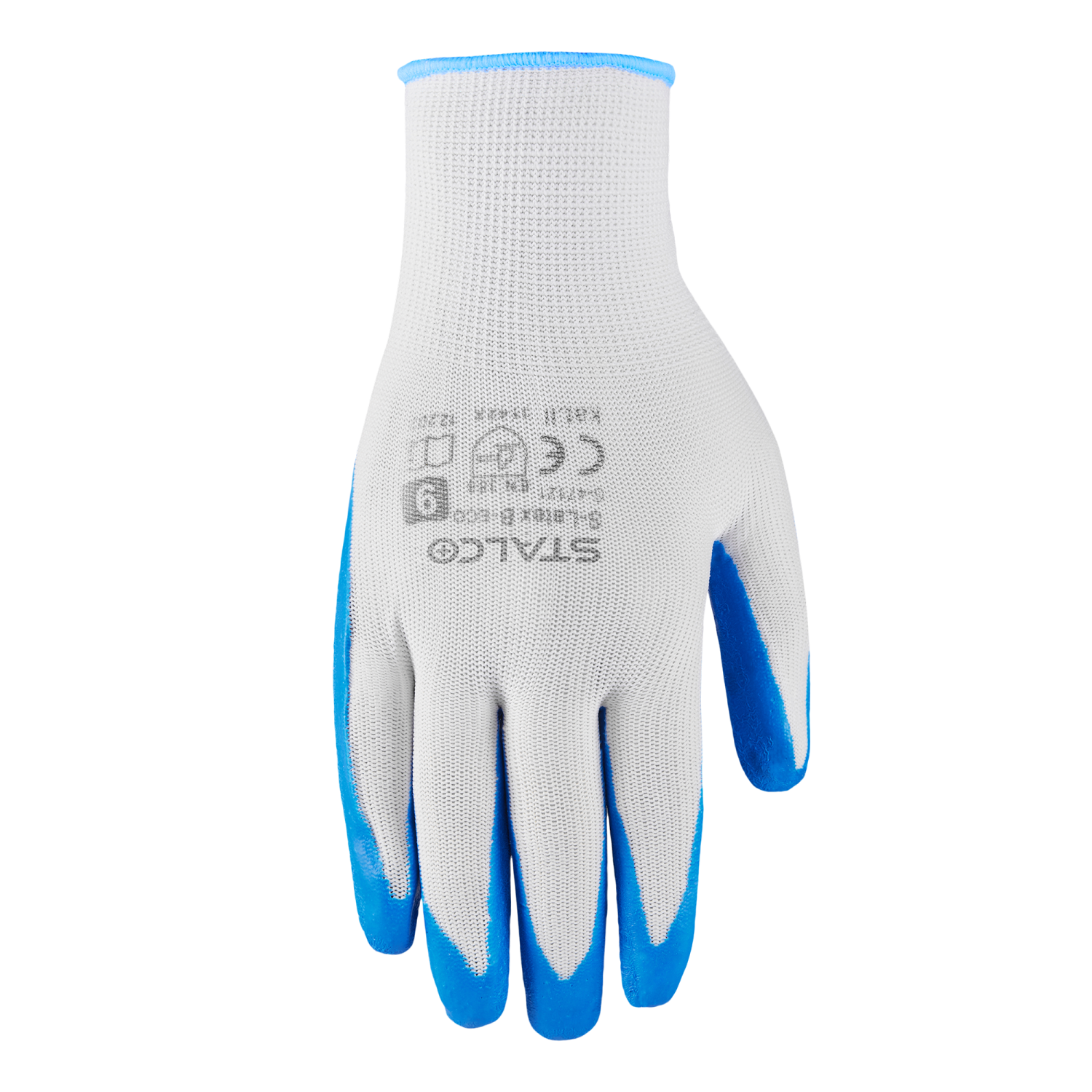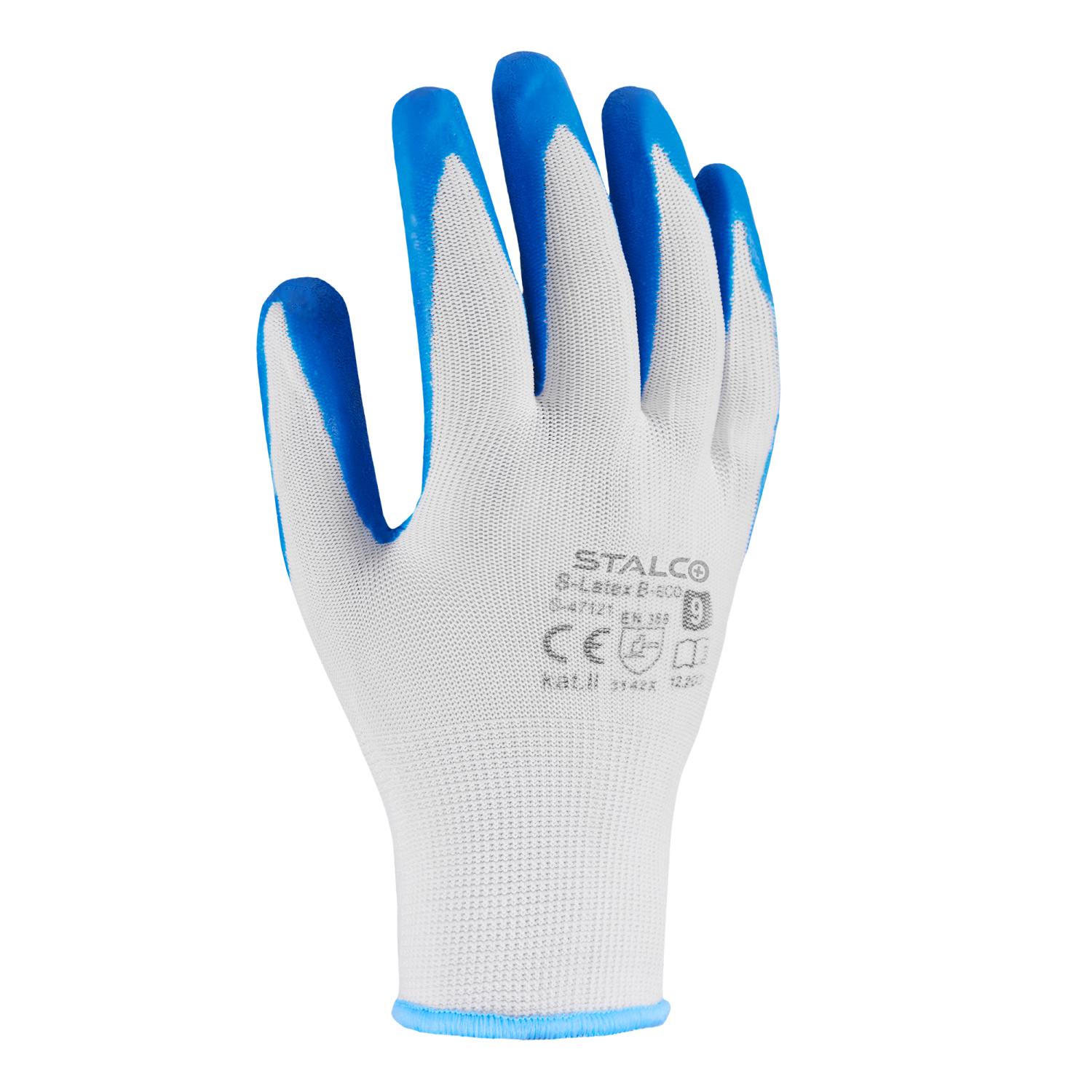 Solidne rękawice poliestrowe Latex B ECO to ochronniki dłoni, które sprawdzą się przy wielu zadaniach. Służą między innymi do ochrony dłoni przed przetarciem i odgnieceniem. Ułatwiają zadania manualne w przemyśle, budownictwie, pracach monterskich, a także rolnictwie. Są zaliczane do środków ochrony indywidualnej kategorii II i spełniają wymagania norm EN 420 oraz EN 388.Rękawice poliestrowe Latex B ECO STALCO zostały uformowane z tkaniny poliestrowej o splocie 13 g. Zapewnia im to dużą trwałość i odporność na działanie wilgoci. Od wewnętrznej strony znajduje się powłoka lateksowa o podwyższonej odporności na ścieranie. Dzięki niej można łatwiej i wygodniej prowadzić prace manualne.