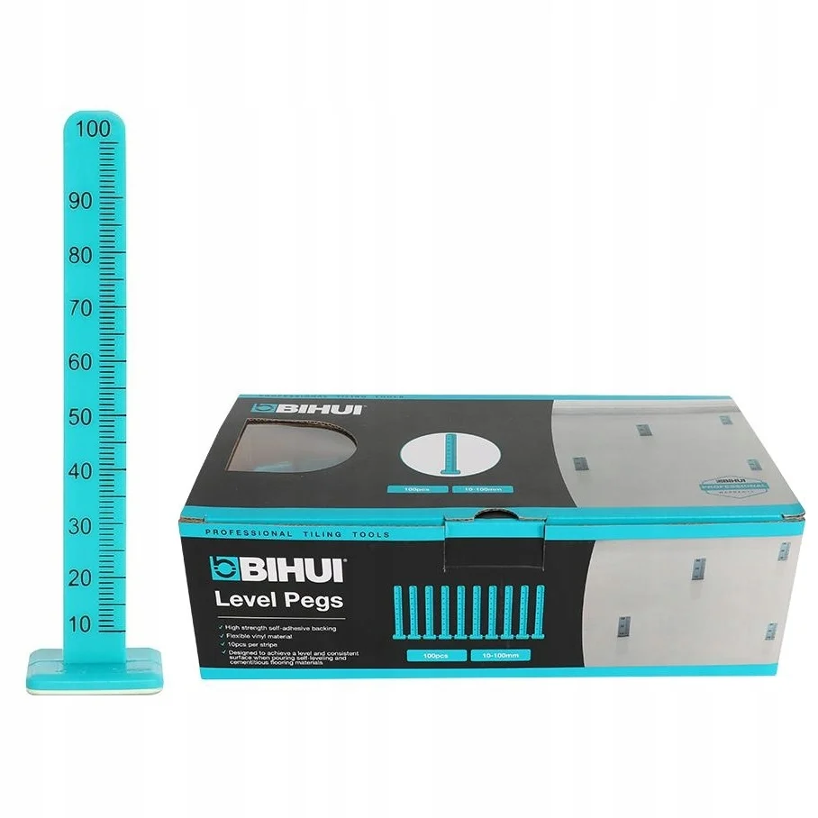 Reper niwelacyjny BIHUI MSLP10 to zestaw 10 samoprzylepnych znaczników o długości 10 cm, zaprojektowanych do precyzyjnego poziomowania podczas wylewania podłóg samopoziomujących i cementowych.
