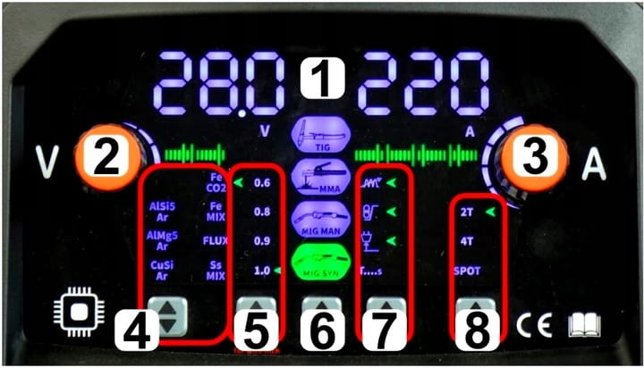 TECNO MIG 224 SYNERGIC LED 4x4 posiada czytelny i łatwy w obsłudze panel funkcyjny, który posiada m.in.: