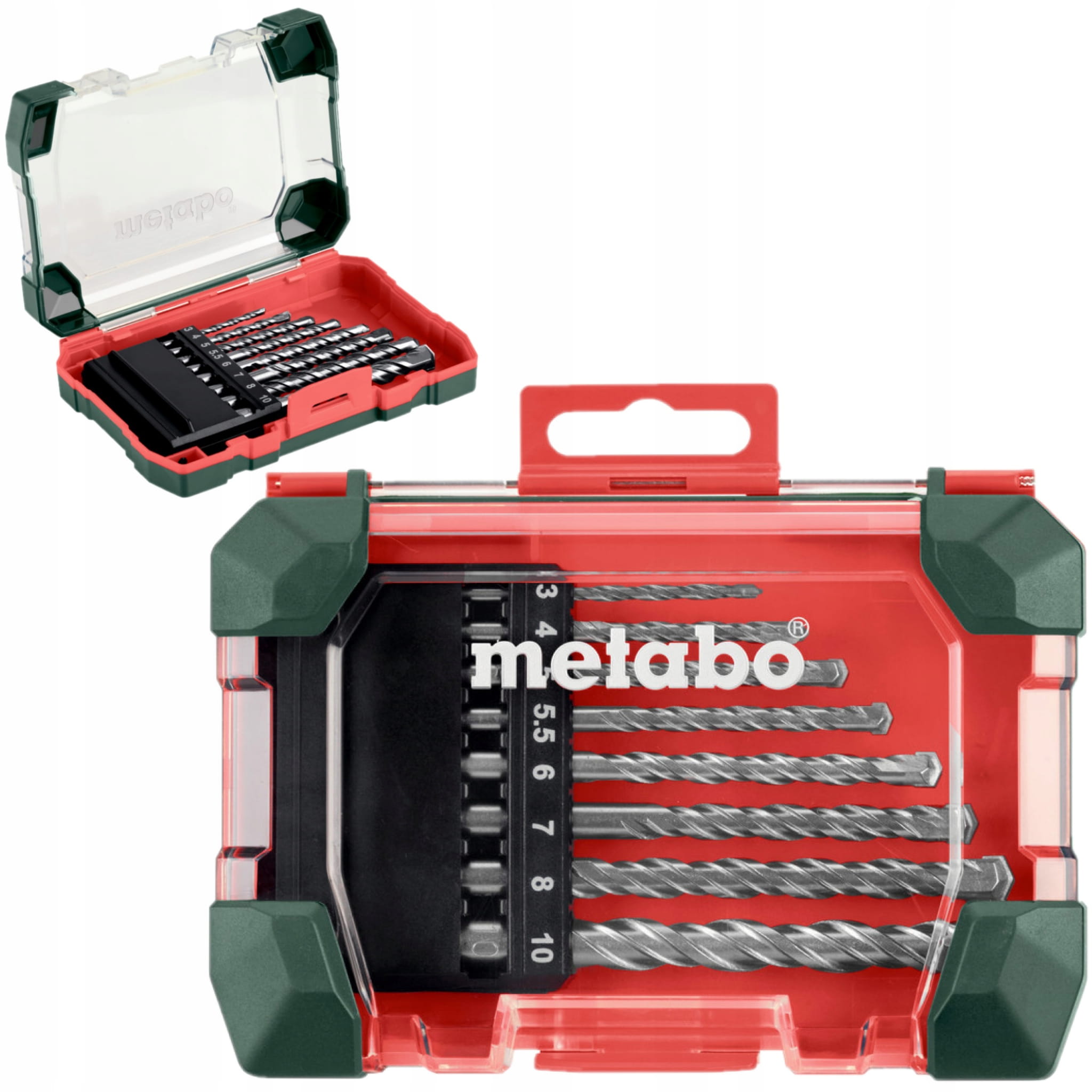 - 8 części zapakowanych w wysokogatunkowej, wytrzymałej kasecie z tworzywa sztucznego w specjalnym wzornictwie Metabo z wysuwaną eurozawieszką; wiertła do kamienia z węglikiem spiekanym, przeznaczone do wiertarek z udarem i bez udaru, frezowane, do wiercenia w cegle, murze itp.
