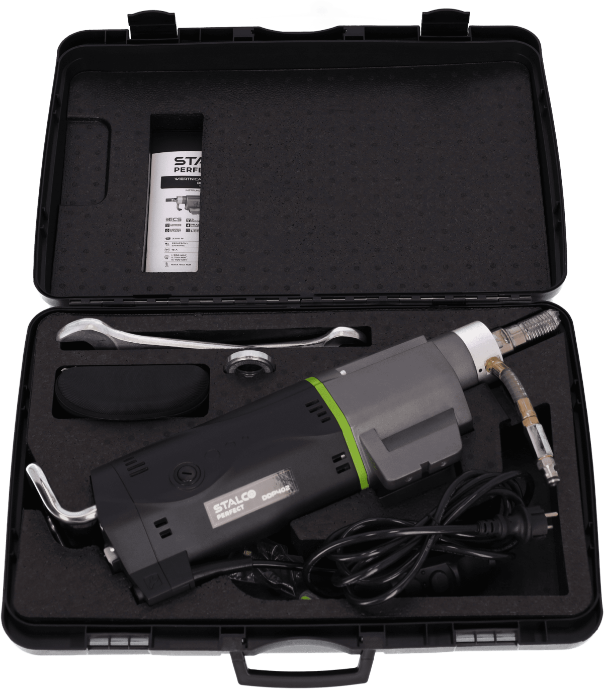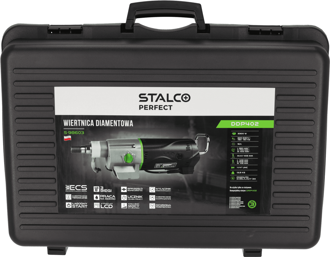 Profesjonalna wiertnica Diamentowa DDP402 to najmocniejsza maszyna do wykonywania otworów wśród elektronarzędzi STALCO. Narzędzie można zastosować do wykonywania przewiertów przez stropy i ściany nawet o bardzo dużej średnicy. Wiertnica Diamentowa 3300W DDP402 została wyposażona w trzy biegi zmieniane za pomocą pokrętła na obudowie, a wybór odpowiedniej prędkości zależny jest od średnicy stosowanej otwornicy. Z kolei w czasie rozruchu urzadzenie wchodzi powoli na obroty, co zapobiega efektowi szarpnięcia w pierwszej fazie wiercenia. Wiertnica Diamentowa DDP402 przeznaczona jest do wiercenia tylko na mokro, dlatego została wyposażona w przyłącze do wody z zaworem. Dodatkowo urządzenie zawiera szereg zabezpieczeń chroniących je przed przegrzaniem, a operatora przed porażeniem.