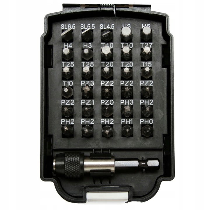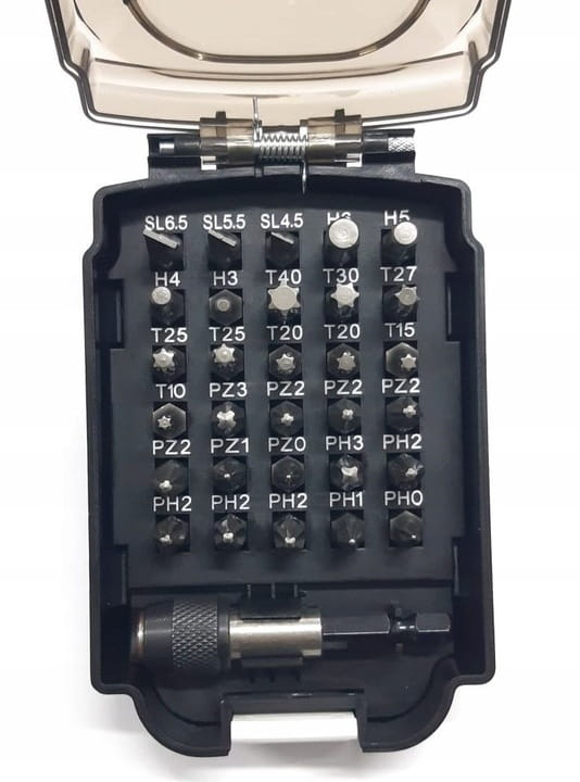 Zestaw 31 bitów, w tym końcówki Philips, Pozidriv, Torx, HEX, i SPLINE, pozwala na szeroki zakres prac montażowych, naprawczych i majsterkowania. Idealny dla profesjonalistów oraz majsterkowiczów.