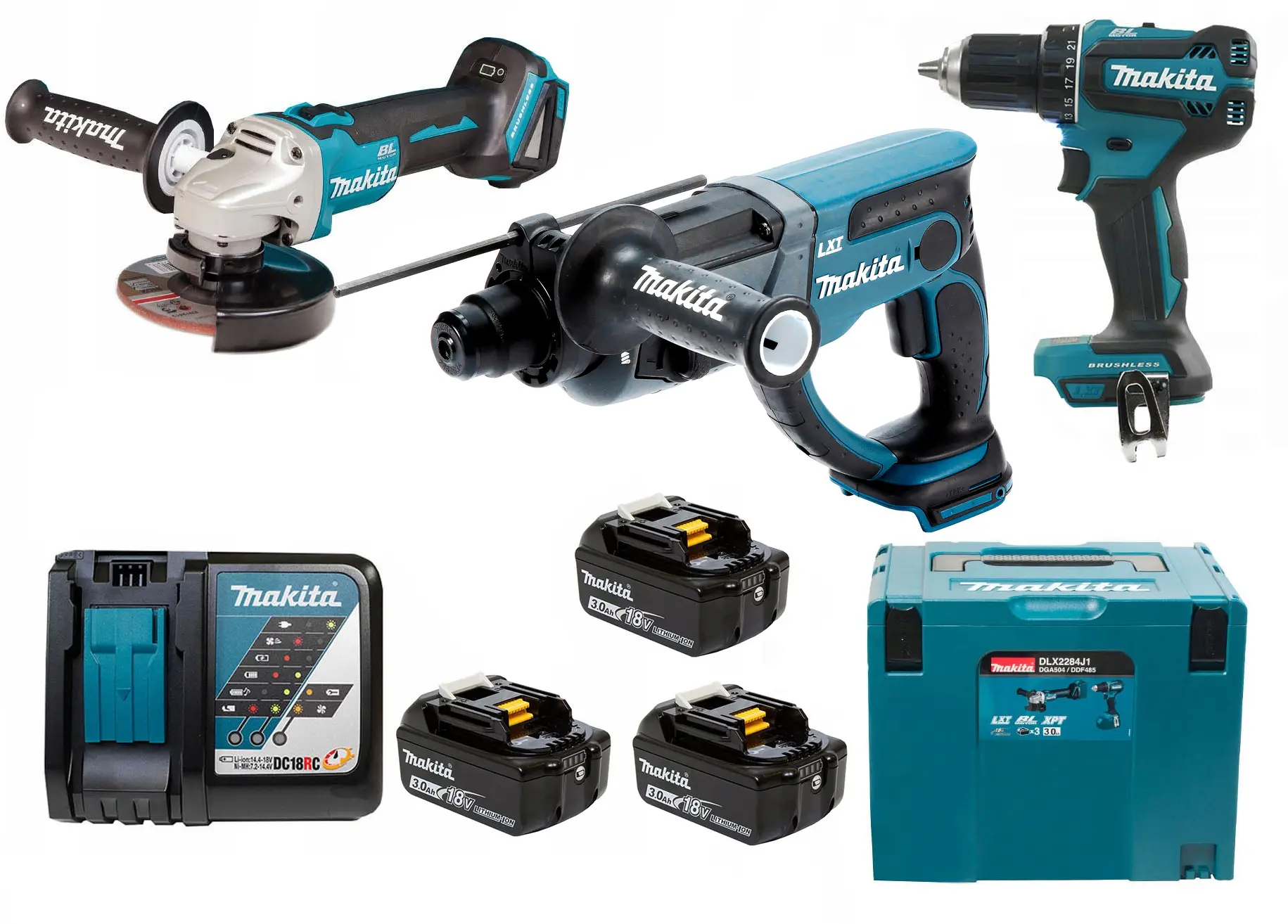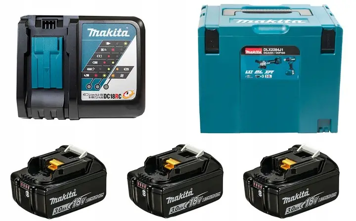 Zestaw Makita Młotowiertarka Szlifierka Wkrętarka z akumulatorami 3,0 Ah
