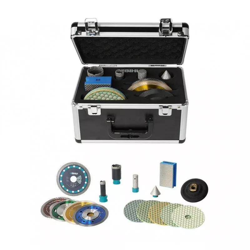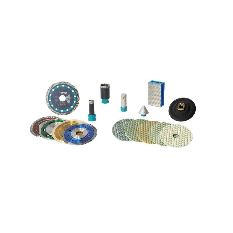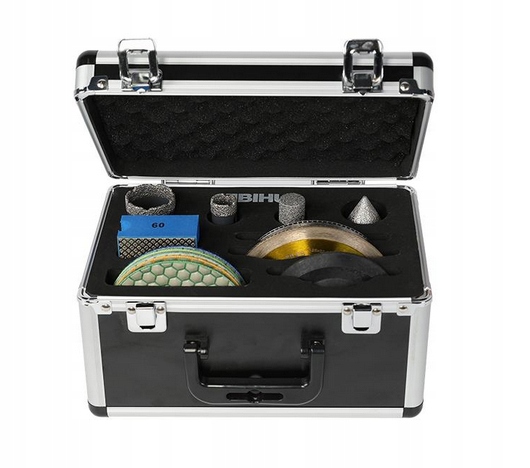 Diamentowe koronki BIHUI sprawdzą się przy wierceniu otworów w najtwardszych materiałach, takich jak gres i marmur, a diamentowe frezy umożliwią powiększanie otworów i wykańczanie krawędzi bez odprysków. Zestaw zawiera także elastyczne tarcze szlifierskie, idealne do polerowania i szlifowania powierzchni z kamienia, oraz 5 różnych tarcz diamentowych, które poradzą sobie z każdą pracą.