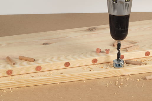 Ten praktyczny zestaw zawiera podstawowe akcesoria do wykonywania połączeń kołkowych w drewnie. Wiertło z precyzyjnie szlifowanymi krawędziami nawiercającymi i kłem centrującym pozwala uzyskać precyzyjne otwory w drewnie, sklejce, płytach wiórowych i pilśniowych. Dzięki odpowiedniemu ustawieniu ogranicznika głębokości na wiertle możemy precyzyjnie dopasować głębokość wiercenia do długości kołka, zapewniając tym samym optymalną stabilność wykonanego połączenia. Teraz możemy przenieść punkt wiercenia za pomocą znaczników na przeciwny element, wywiercić w nim otwory i wykonać połączenie w drewnie przy użyciu dostarczonych kołków.